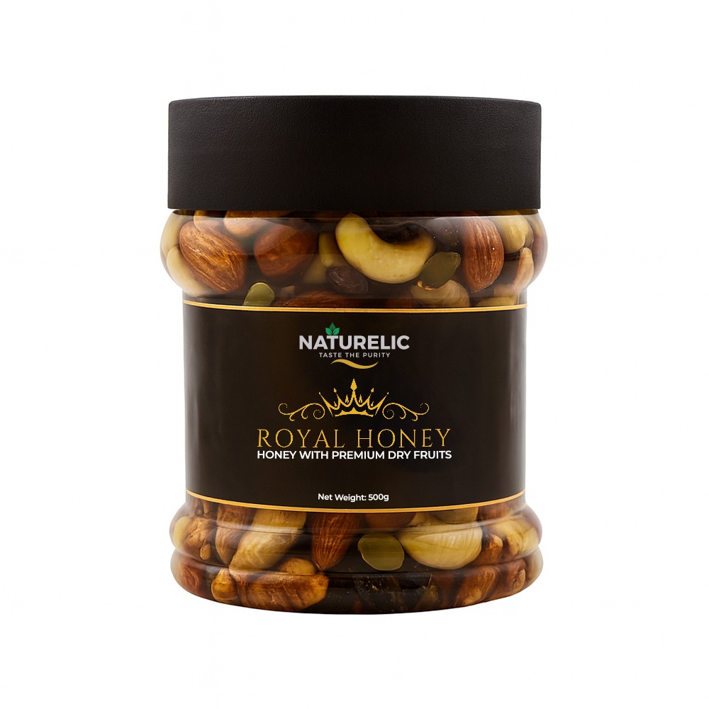 Experience the richness of pure golden honey blended with the finest premium dry fruits. Naturelic Royal Honey is a powerhouse of taste, nutrition, and natural energy crafted for those who want the perfect blend of wellness and indulgence in every spoon.